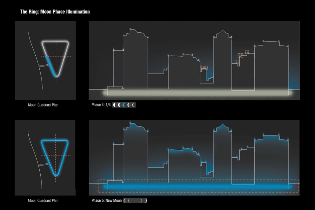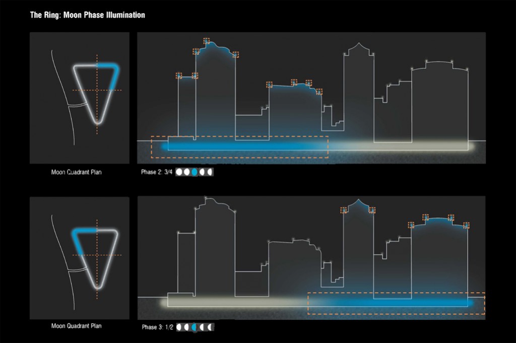 Our proposal links the ring path to the changing phases of the moon, registering a change from white to blue which moves around the island over the course of each lunar cycle.
