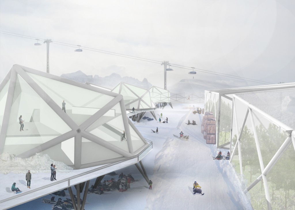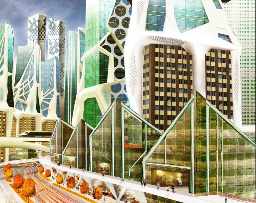 In the 2100 world the book envisions, most of the earth’s population has moved poleward, now inhabiting compact megacities. Some, like Troll Antarctica, are new, while others like Moscow, Vancouver and Johannesburg have been redesigned and retrofitted as hyper dense settlements. These megacities are paired with the now largely uninhabitable extraction cities of the middle swath that now house smaller scale populations of temporary inhabitants. To accommodate the needs of a world population of 10 billion, the new compact megacities feature technologies such as clip-on architecture and high tech vertical farms while the old, extraction cities have become outposts that are being recycled and used for manifold purposes including renewable energy generation, carbon capture and sequestration.