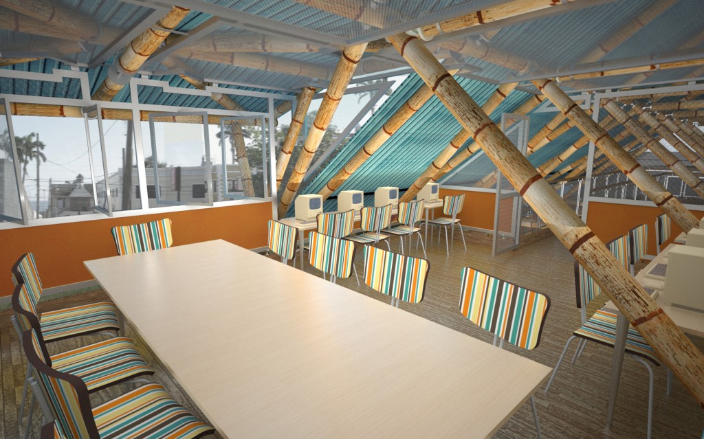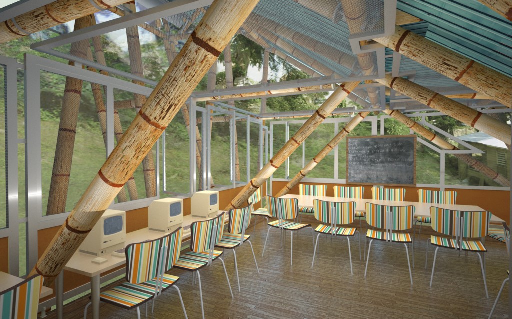 This building is envisioned as a showcase of sustainable materials and systems appropriate for developing countries, and began as the subject of a Design/Build course at City College in New York. In the Spring of 2006, a group of enthusiastic students began exploring the many possibilities of sustainable architecture and green building design in Jamaica along with professors Oisin Clancy and Vanessa Keith. Both are founding members of Inter-Build.org, the building and architecture arm of Edu-Tourism, an NGO based in Jamaica. The first phase of design was taken to Jamaica and presented to the WCJF as well as teachers and other end users, and the valuable feedback gained from this exercise was brought back to New York for further development. The current project is a revision conducted by Studioteka over the course of the past year, and features the introduction of a system of structural bamboo connections as the building’s primary structure, which is configured and oriented for passive cooling. Also included are an integrated wind turbine, graywater treatment and an alternative sustainable septic system.