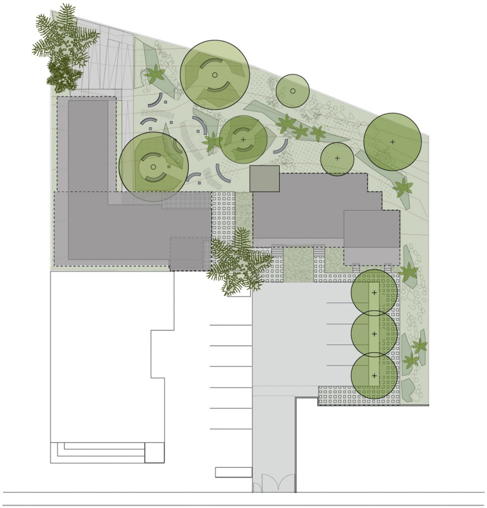 The skills training area contains a meeting table which can accommodate 10 people, as well as workstations and computers for 8 people who can use them to learn valuable workforce related skills. The small sitting area at the top of the stairs has room for a couch and an end table, and is a place of conversation or repose, enlivening the zone at the top of the stairs. The surrounding landscape has been activated by the insertion of seating which rings the trees, as well as a series of planting beds which create an informal garden atmosphere.