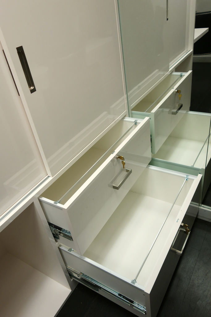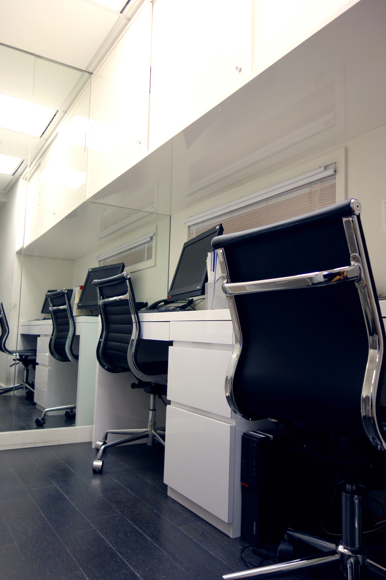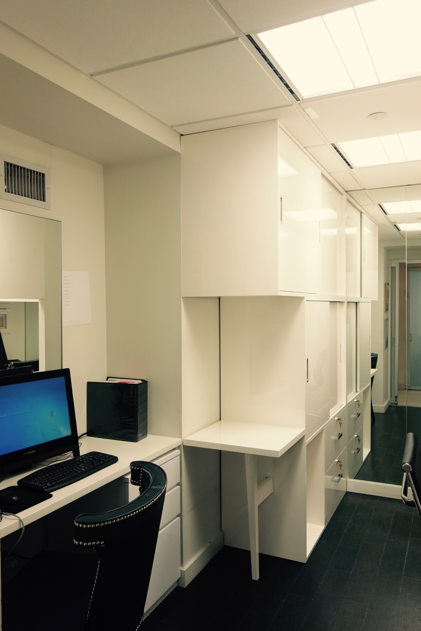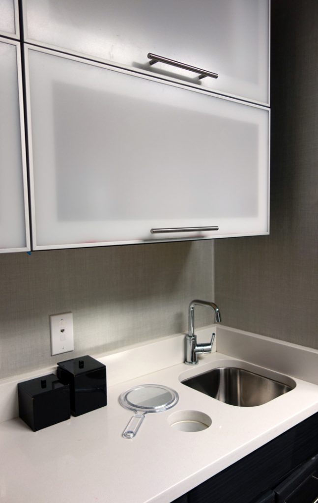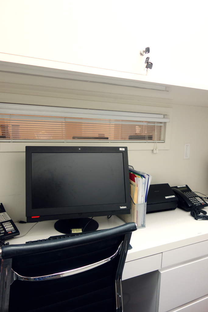 Studioteka also designed custom cabinetry for an administrative office in the space in order to maximize storage in the busy practice. A new floor to ceiling unit was built along the eastern wall of the space which incorporates two lockable file drawers for confidential documents, a fold down laptop desk, and a series of storage areas with sliding doors in white Wilsonart laminated mica. The workstations on the opposite side of the room had a new wall unit installed above the desks with three sliding, lockable doors for the doctors’ medical supplies. This allows for a much more efficient use of the space, and keeps everything tidy and organized.