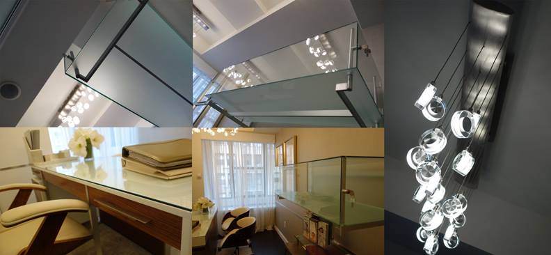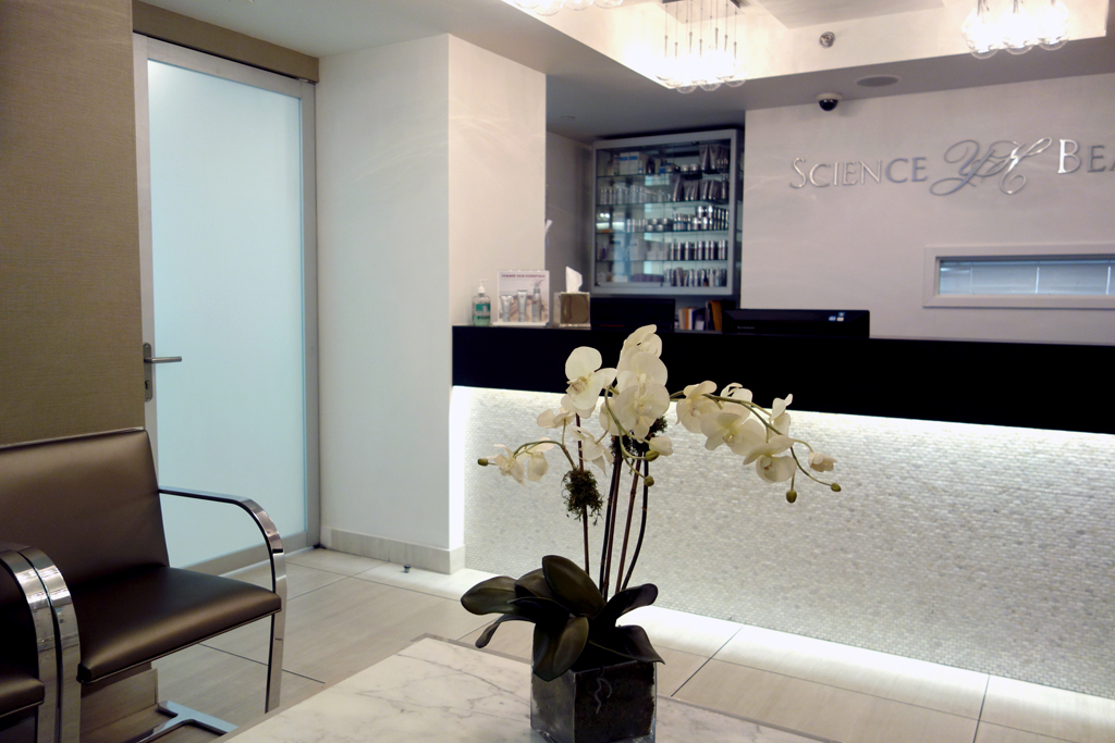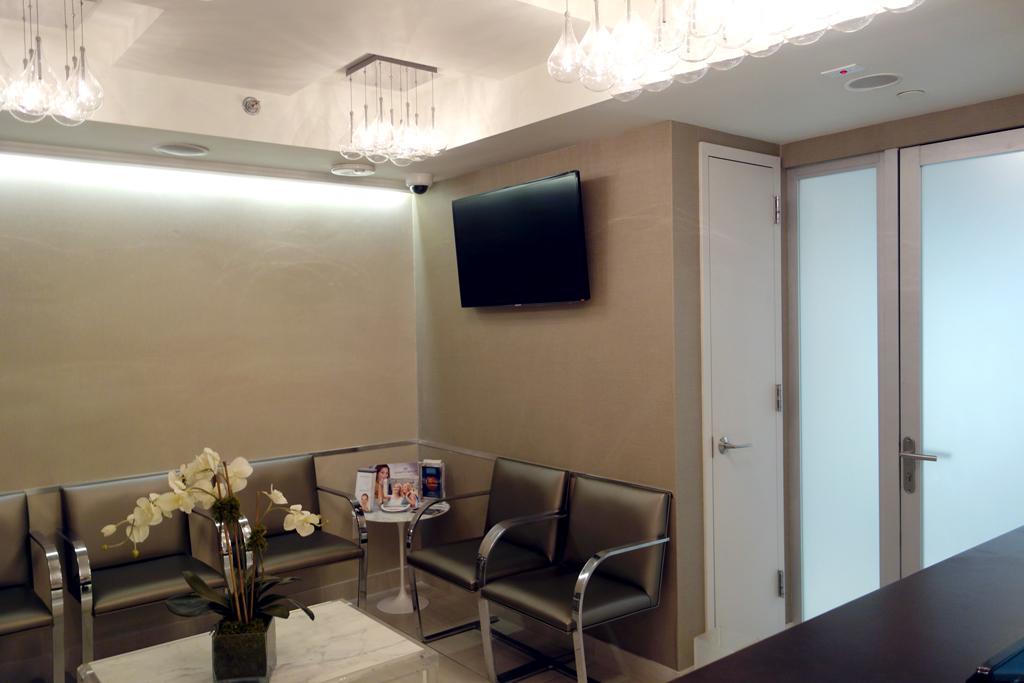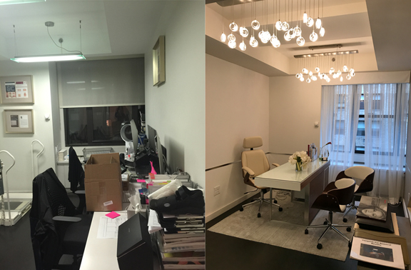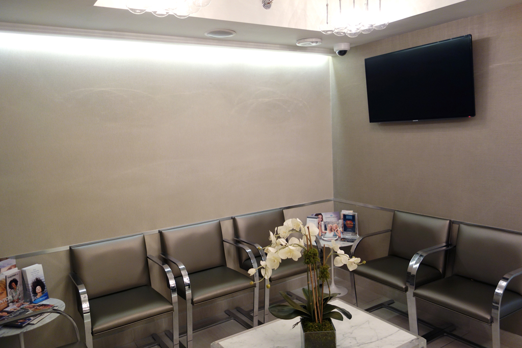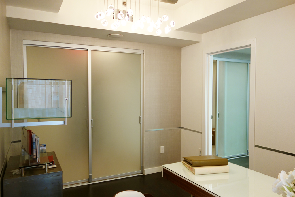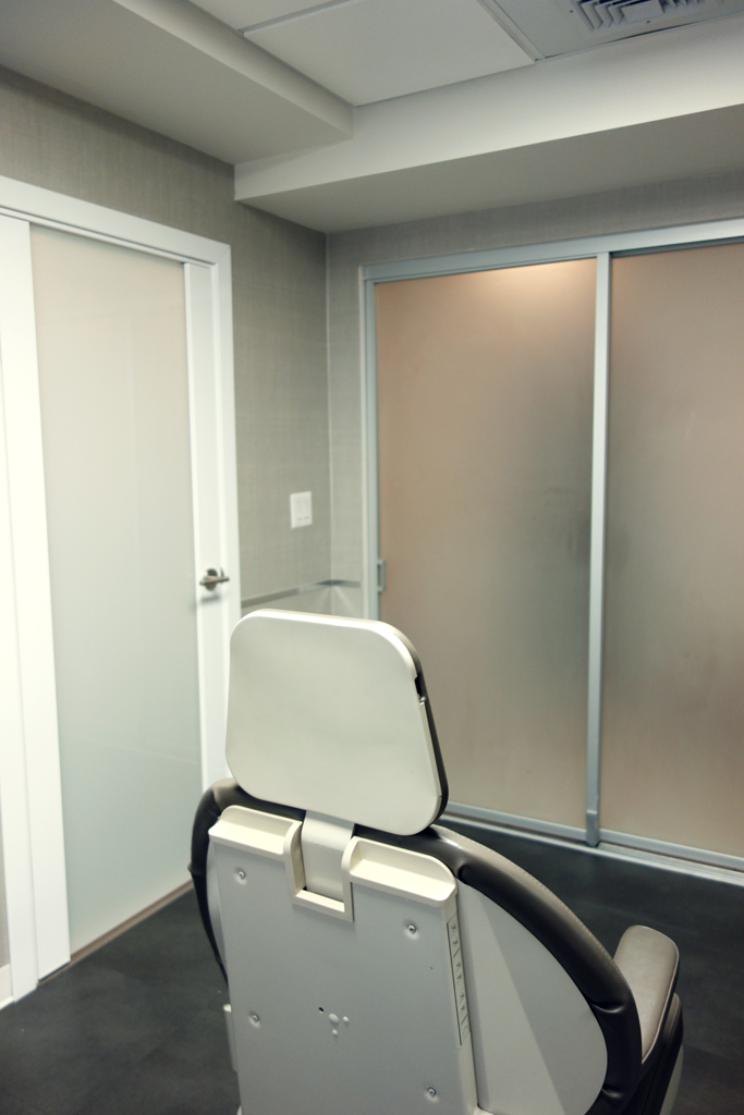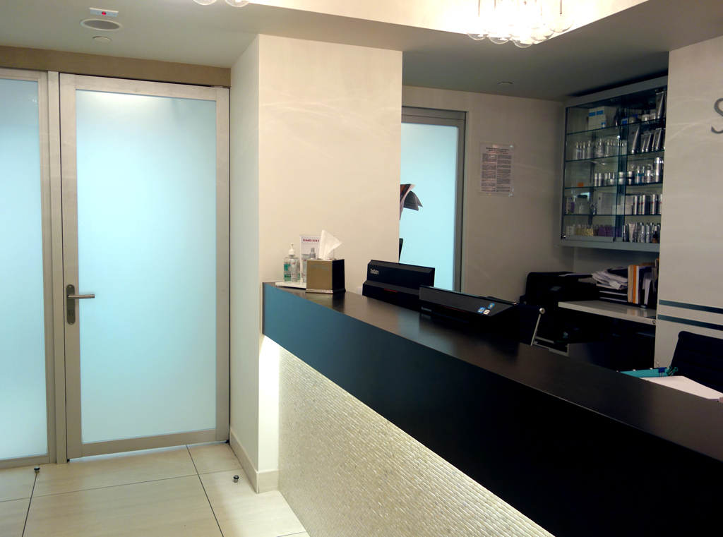 The reception and waiting areas were given a much needed face lift with the addition of dimmable overhead fixtures as well as accent lighting which washes the front of the reception desk as well as the wall immediately facing it in the waiting area. The reception desk top was custom refinished and hand painted to have the feel of warm brown leather, contrasting with the cool white tiles below. Sleek metal chair rail behind the desk and in the waiting area both accents and matches the metal of the chairs, with their custom upholstery. New subtly contrasting wallpapers from Maharam finish the space off and add to the new Zen effect, creating an atmosphere which is both relaxing and welcoming for the doctor’s busy clients. Project Team: Vanessa Keith, Yuhui Huang, Tae Hyung Kim.