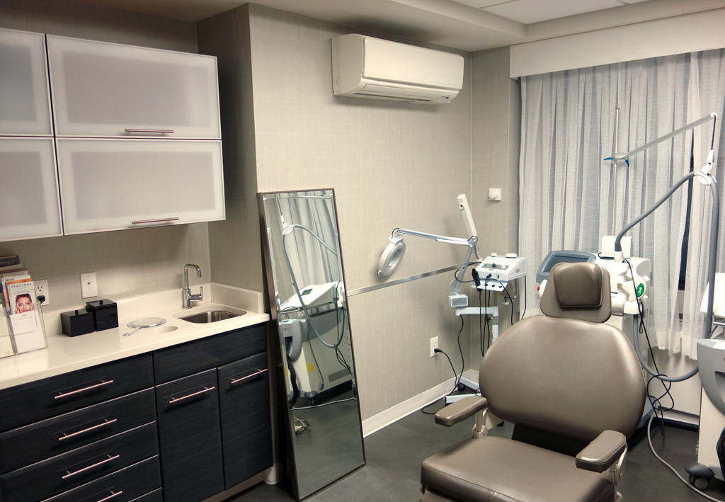 The consult room, which had been a cluttered administrative office, was completely transformed by Studioteka. A BDI desk with a white top and warm walnut accents was chosen, along with a Lumi Source office chair for the doctor, and a pair of Liam office chairs, both in white with walnut accents, for clients. A Safavieh rug provides a contrast with the warm brown of the hardwood floor, while two new linear suspension chandeliers brighten and warm the space. A sleek custom display case by Alinea was mounted on the eastern wall, allowing the surgeon to prominently display her own line of spa facials and products. New custom draperies with sheer white fabric from Knoll, were made for both the consult and spa treatment rooms. Both spaces had new Maharam wallpaper installed along with sleek metal chair rail around the perimeter of each room completing the transformation.