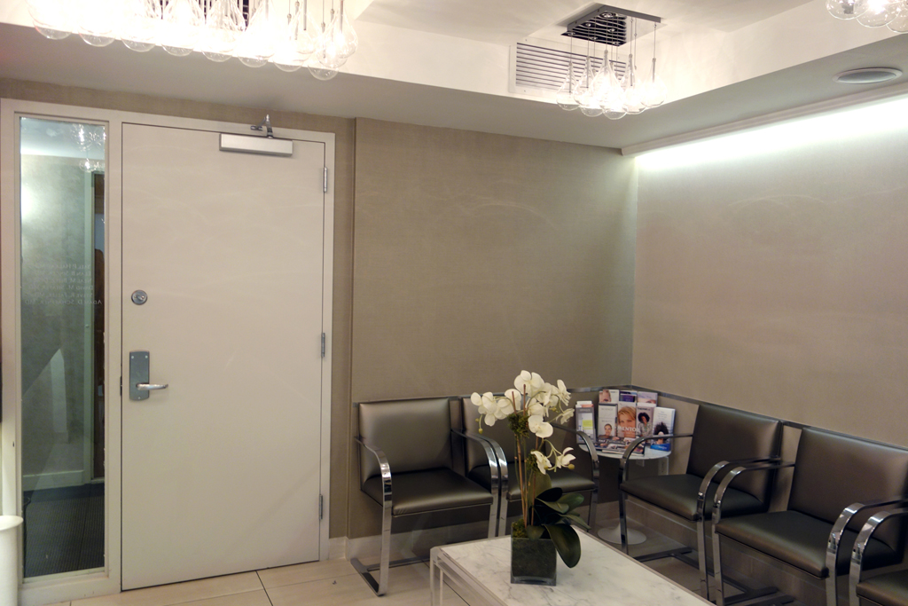 Studioteka was asked to rework the design of an existing medical office suite in Manhattan’s Midtown East for a successful, high powered plastic surgeon. The existing suite lacked a consult room where the surgeon’s upscale clientele could meet with the doctor or staff to discuss procedures and options. The doctors sharing the 1,865 SF office suite had been holding patient consultations in the existing procedure rooms, rather than in a designated space. They felt that this limited their ability to really connect with clients in a safe space, and wanted the new consult room to feel warm, inviting, and luxurious. A connection between the consult room and an adjacent procedure room was suggested by the design team, effectively turning the two rooms into a new spa consult suite.