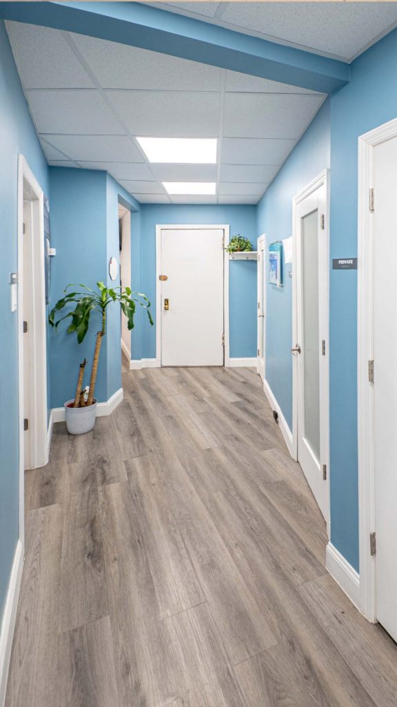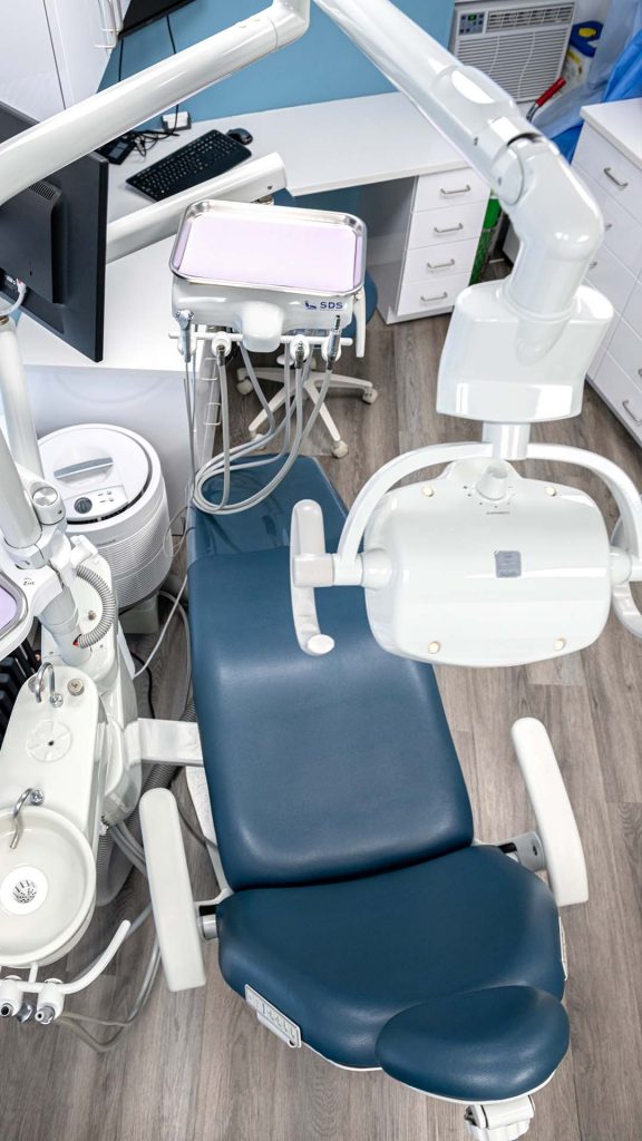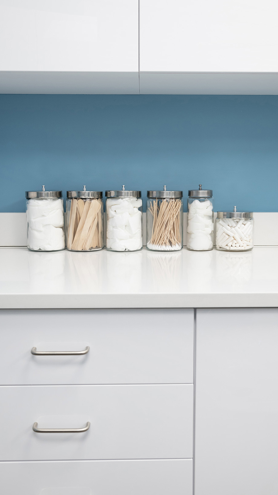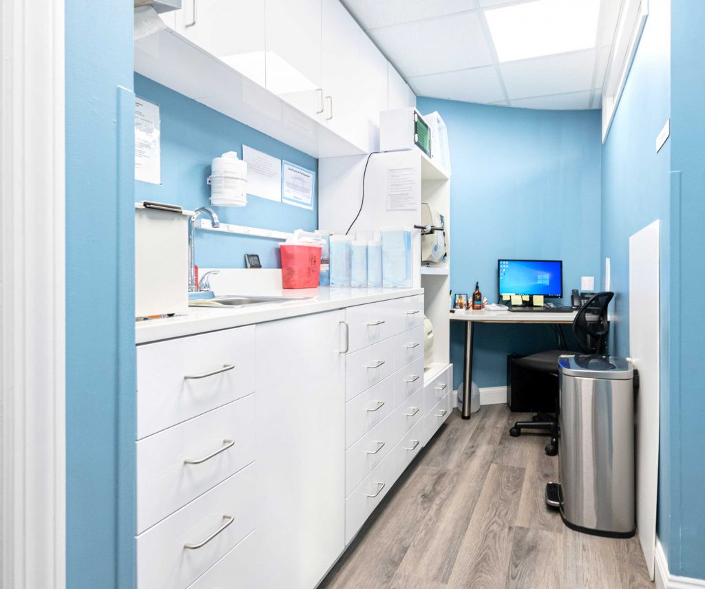 The AIDA office interiors were reconfigured and upgraded to have a medical operatory, a second procedure room that also functions as a patient consult space, and a brand-new laboratory for the custom fabrication of implants in-house. Studioteka also designed two new dental hygienist rooms, as well as custom cabinetry for all the rooms. Brand-new driftwood gray floors and a gorgeous shade of blue are integrated into all the lab and procedure rooms, helping practitioners reset their vision when doing expert color corrections, whitening, and dental implants. The procedure room and hygienist areas had bespoke alabaster-white glossy cabinets, clerestory windows, and new inset glass doors installed to contrast with the shades of blue in the color scheme; this allows natural and artificial light to gently bounce which opens up and illuminates the spaces. The ceiling and existing lighting were stripped down and replaced with a new acoustical ceiling with crisp, white LED lighting, allowing for a sense of quiet within the rooms of this busy practice.