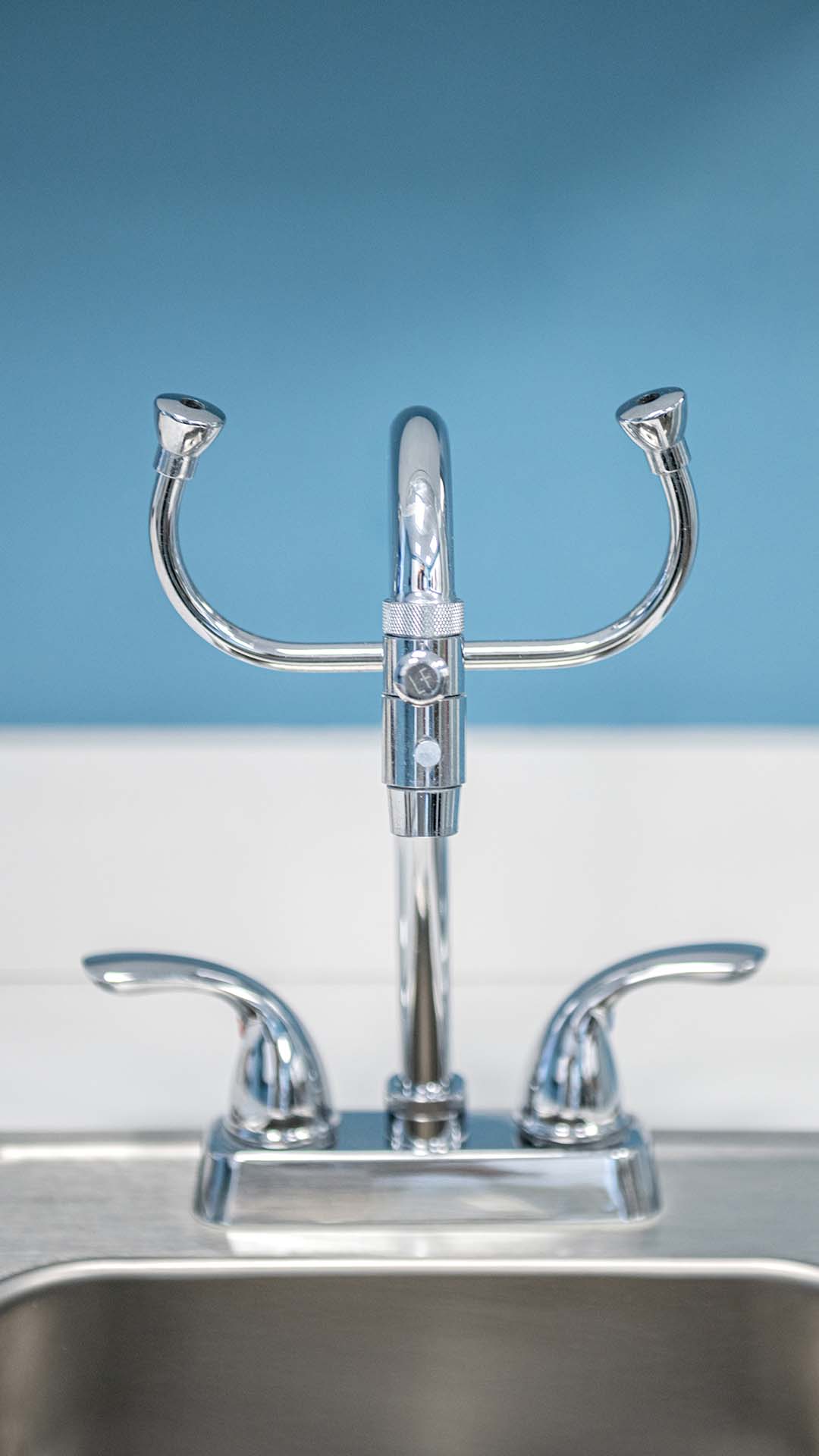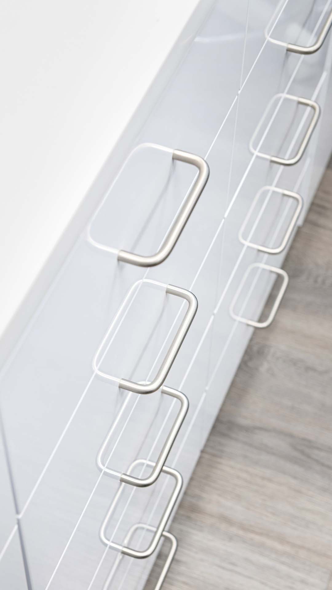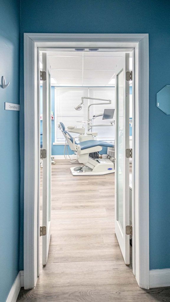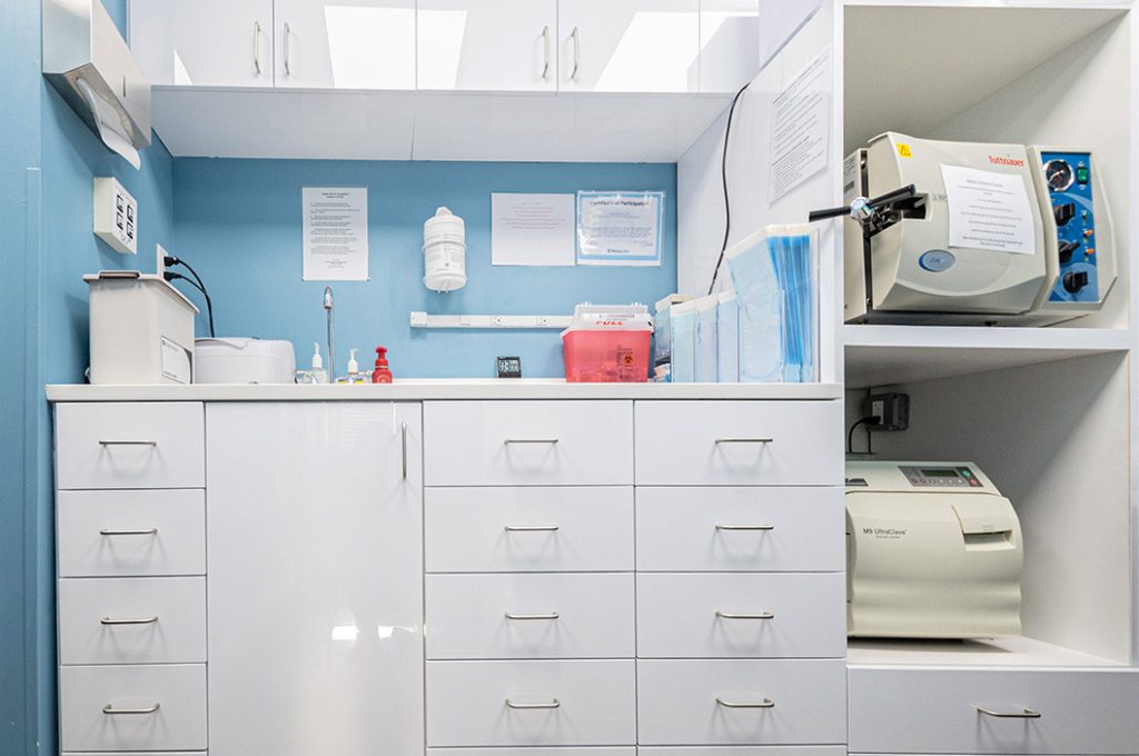 The AIDA office interiors were reconfigured and upgraded to have a medical operatory, a second procedure room that also functions as a patient consult space, and a brand-new laboratory for the custom fabrication of implants in-house. Studioteka also designed two new dental hygienist rooms, as well as custom cabinetry for all the rooms. Brand-new driftwood gray floors and a gorgeous shade of blue are integrated into all the lab and procedure rooms, helping practitioners reset their vision when doing expert color corrections, whitening, and dental implants. The procedure room and hygienist areas had bespoke alabaster-white glossy cabinets, clerestory windows, and new inset glass doors installed to contrast with the shades of blue in the color scheme; this allows natural and artificial light to gently bounce which opens up and illuminates the spaces. The ceiling and existing lighting were stripped down and replaced with a new acoustical ceiling with crisp, white LED lighting, allowing for a sense of quiet within the rooms of this busy practice.
